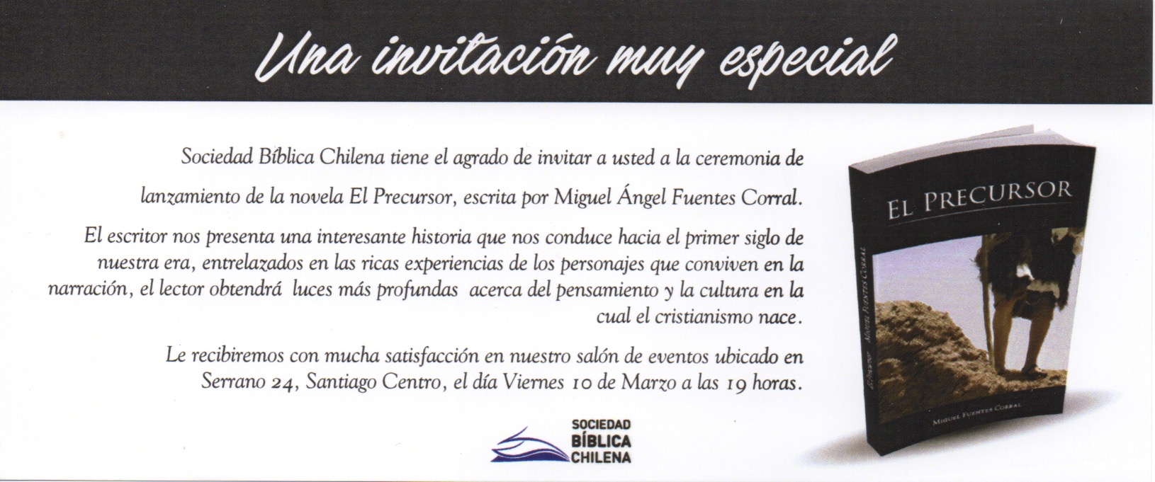 Home » Noticias » Lanzamiento del Libro El Precursor de Miguel Ángel FuentesLanzamiento del Libro El Precursor de Miguel Ángel Fuentes Invitación a Lanzamiento de Libro Cristiano del pastor Miguel Angel Fuentes Corral https://www.facebook.com/events/1821726674743896/ ** Notas Relacionadas: UNESCO reconoce el trabajo de alfabetización de Sociedad Biblica Lanzamiento de libro: Biblia y Patrimonio histórico Lanzamiento libro Herejía en Chile del Dr. Humberto Lagos Lanzamiento del Nuevo Testamento en Rapa Nui Lanzamiento de talleres de alfabetización y violencia intrafamiliar